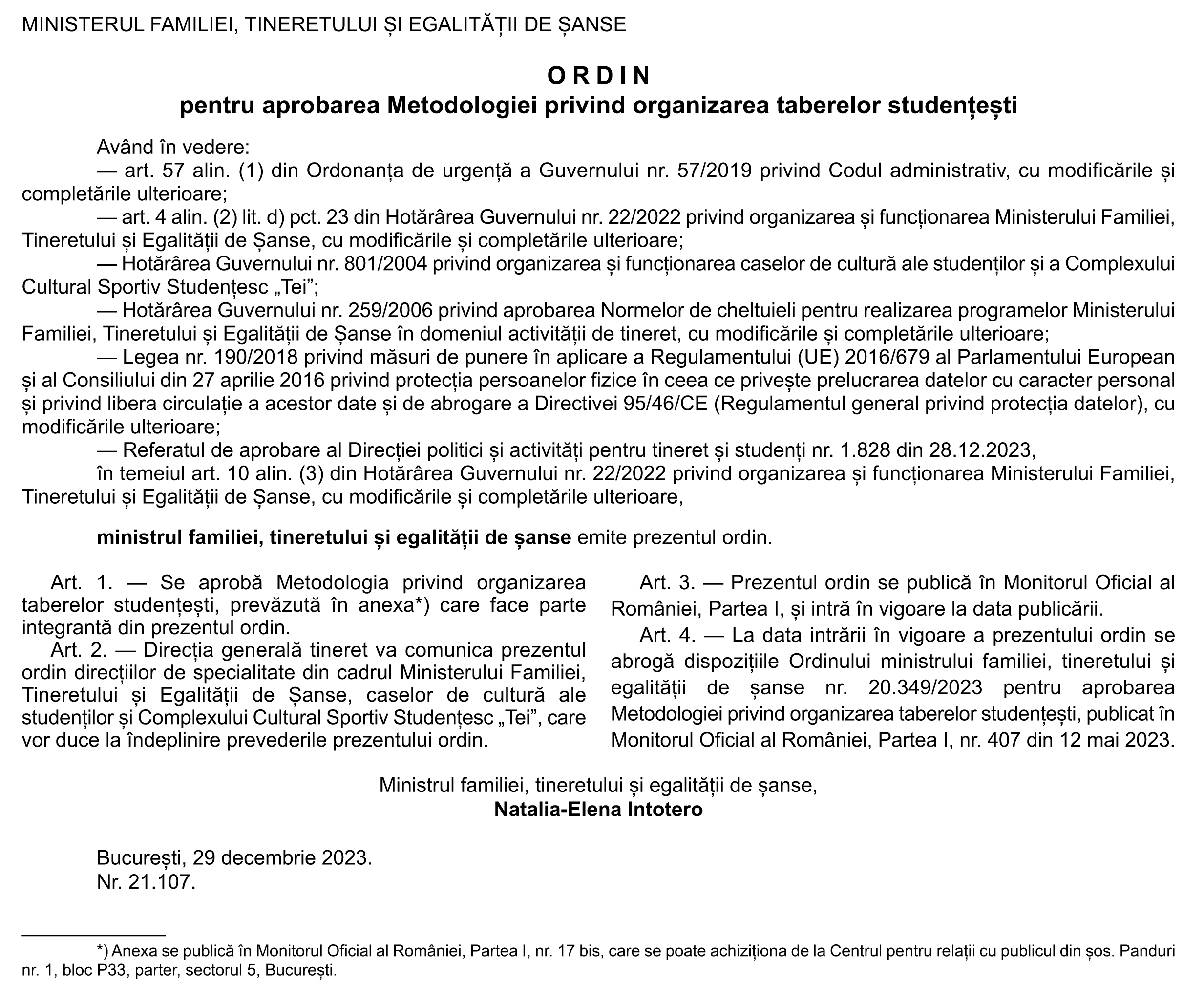 Monitorul Oficial (Partea I, nr. 407 bis, Tabere studenţeşti)